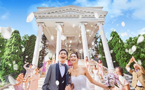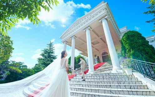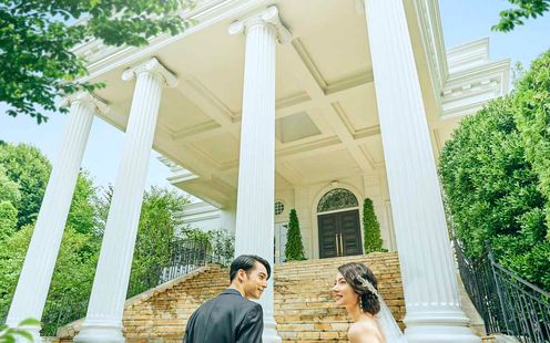 貸切邸宅の広大な敷地内にひときわそびえ立つ白亜の大聖堂。レッドカーペットがあしらわれた大階段は人気の撮影スポットです。晴れて夫婦になった後のフラワーシャワーやブーケトス、バルーンリリースなどのアフターセレモニーはふたりの心に生涯刻まれる思い出に…。