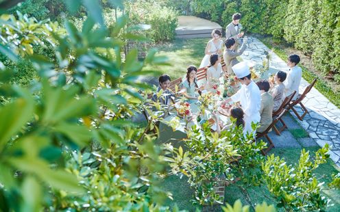水と風を感じる開放的なガーデンでは挙式をはじめ、ふたりならではの演出でおもてなしを