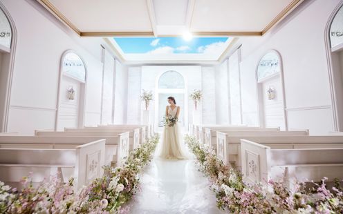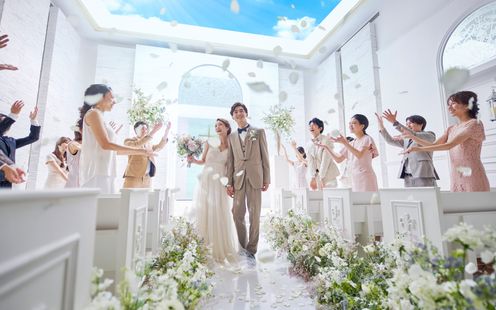 天窓からの青空をのぞむ光あふれる純白チャペルは、天井高7mの開放感あふれる空間。挙式後はプライベートガーデンでフラワーシャワーはもちろん、ブーケトスやバルーンリリースなどの多彩なアフターセレモニーをお楽しみいただけます。また、ガーデンセレモニーも可能ですので好みの挙式ステージをお選びください。