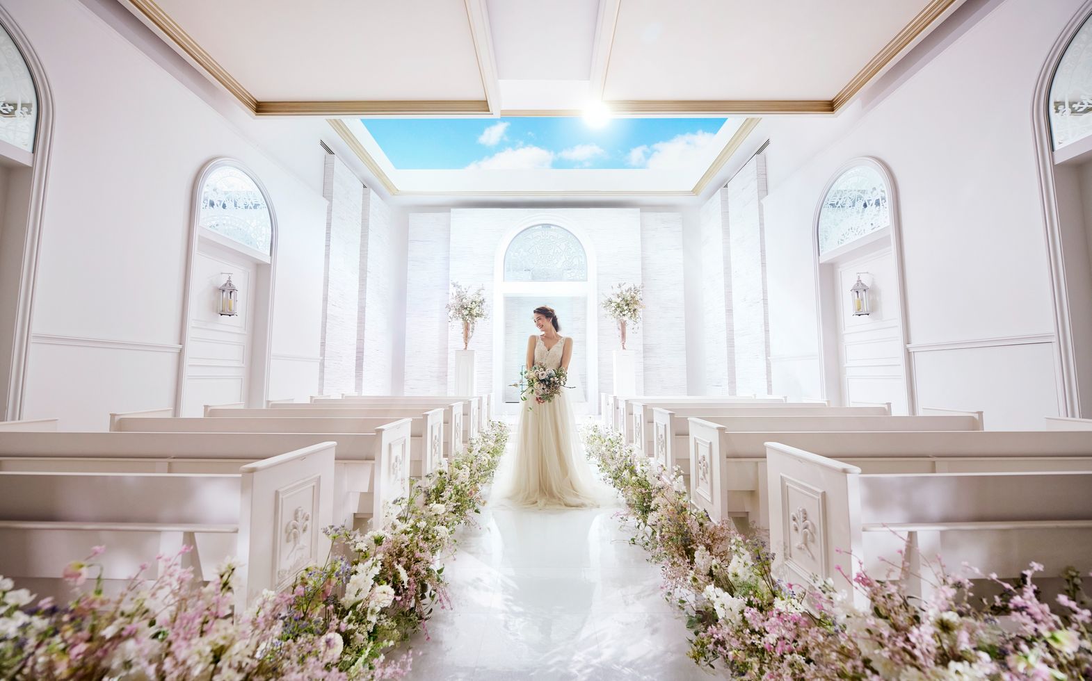 天窓から優しい光が差込む真っ白なチャペルで温かなセレモニー