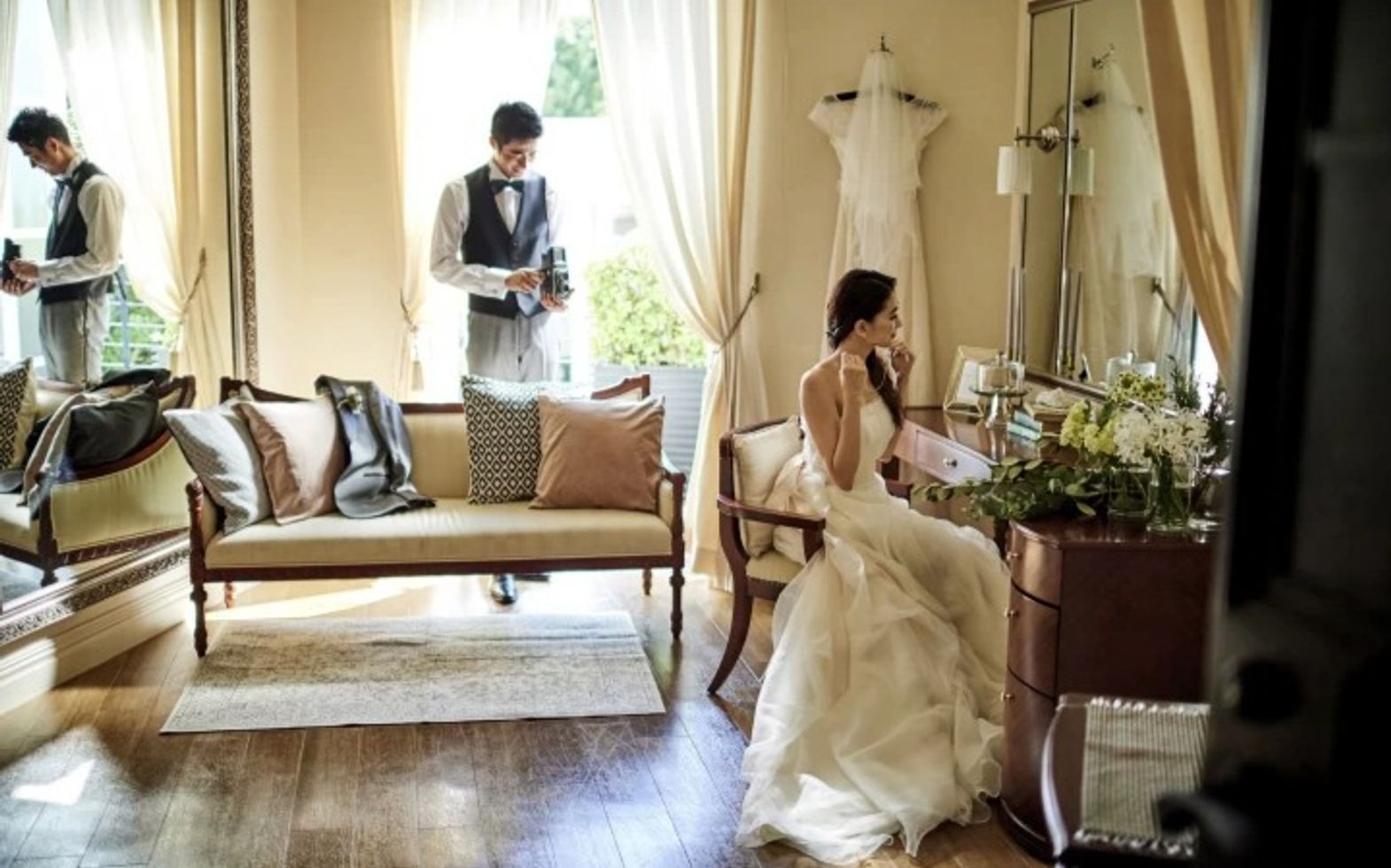 やわらかな光が差込み、優雅な気分でお支度をしていただける落ち着いた雰囲気のプライベート空間。ゆったりとした空間で純白のドレスを身にまとい、これから始まる特別な一日への気分を高めていただけます。親族にゆっくりお待ちいただける部屋や、ゲストの着替えスペースも用意しております。