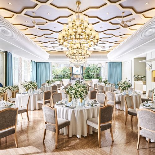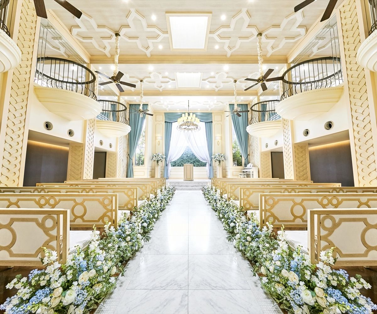 オペラシアターがモチーフになっている、クリームとブルーの色合わせがとってもかわいいチャペルです⛪️