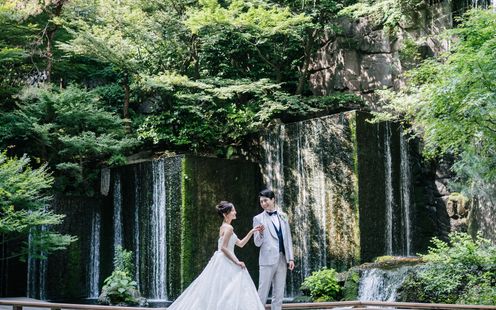 自然豊かな庭園には、高さ7mの滝など至る所がフォトジェニックなフォトスポットに!滝のすがすがしい空気と、都心とは思えないほどの自然美豊かな庭園の静寂に包まれながら、 ゆったりと撮影をお楽しみいただけます。おふたりでご家族で想い出の写真をたくさん残してみてはいかがでしょうか?衣裳・撮影データ付きのフォトウエディングプランもご用意しております。プランページもぜひご覧ください。