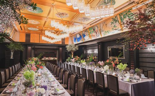 旧目黒雅叙園から移築した天井画や連作壁画に、ヨーロピアン調のシックな家具が調和した会場。格調高い大人のカップルにぴったりの雰囲気です。