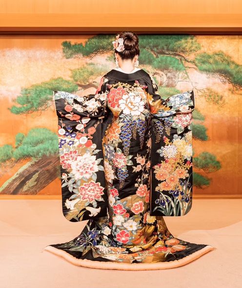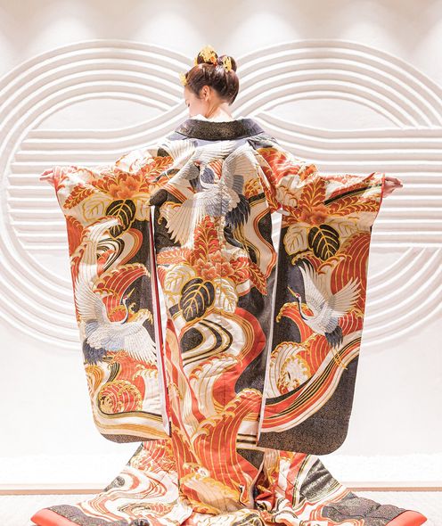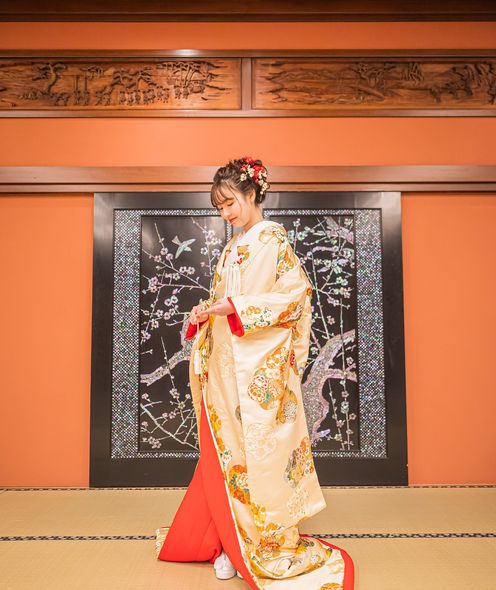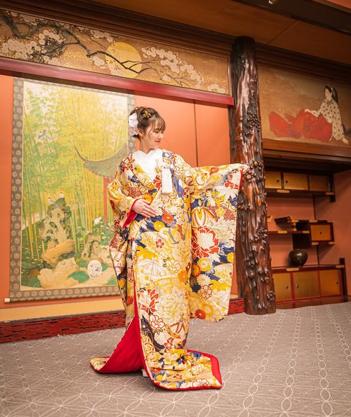 和室の玄関は、昔の目黒雅叙園の正面玄関を再現した場所。豪華絢爛な空間は時を越えて祝いの色が溢れ出しています。日本の結婚式は古から、吉祥を表す松や梅、扇の文様。人々を守るアカ(赤)や、若さを願うもえぎ色(緑)純真さを表すシロ(白)は白無垢として、大切な日を伝統的な色や柄で鮮やかに彩られてきました。祝いにあつまったすべての人に幸せが訪れるように、願いを込めた芸術空間は、一生に一度のふたりの門出に日本らしい華を添えます。