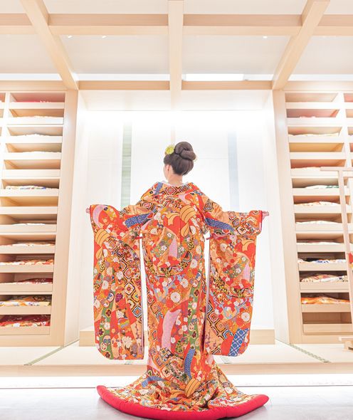 一歩足を踏み入れた瞬間から、壁面や天井にいたるまで祝いの意味を込めた色彩が広がる非日常空間。