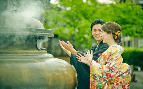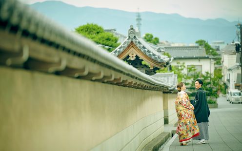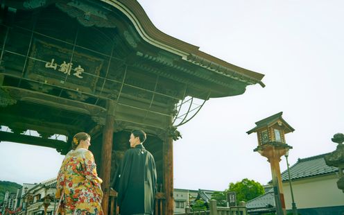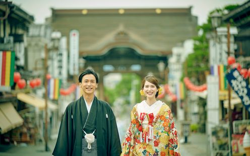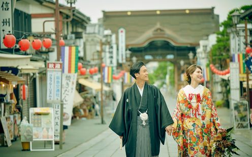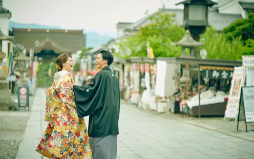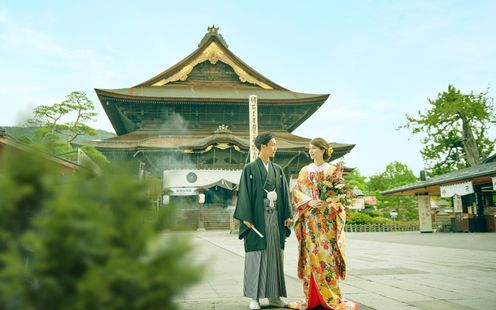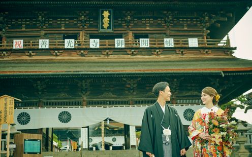 国宝・善光寺で本格的な仏前結婚式が叶うのも魅力!藤屋から表参道を歩き、善光寺へ。伝統的な結婚式を希望されるふたりにとって、善光寺は憧れの場所。善光寺大勧進、大本願での挙式を専属プランナーがサポートいたします。