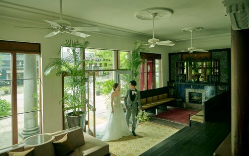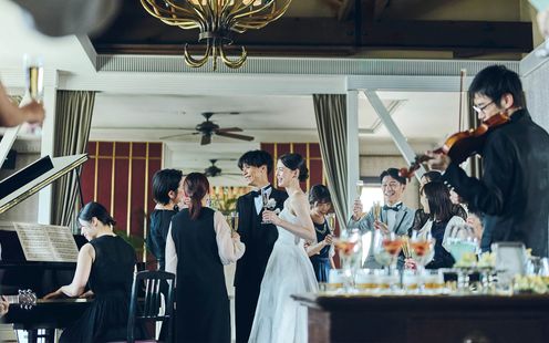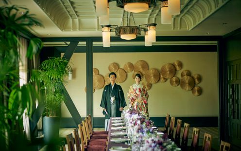 目の前に広がる蔵造りの街並みがふたりの祝宴を彩る「ザ・サンドウ」。伝統美が息づく上品な空間はどこかオリエンタルなムード漂い、艶やかな和装も美しく映えます。ゲストとの距離が近いアットホームな雰囲気の中、バーカウンターやソファを備えた贅沢な設えで、ふたりの我が家に招くような寛ぎのひとときを演出。親族中心の食事会や内輪婚にも最適で、ワンランク上のおもてなしとともに、絆が深まるあたたかな時間をお過ごしいただけます。