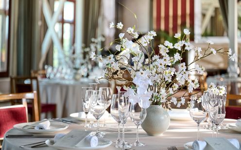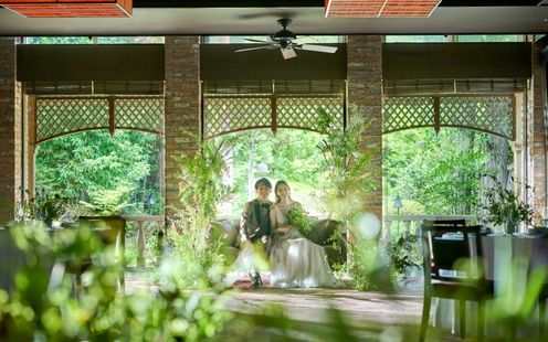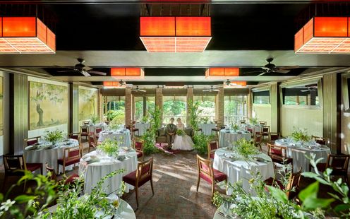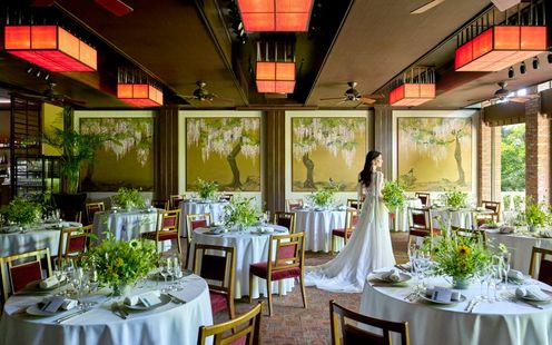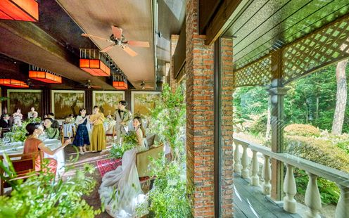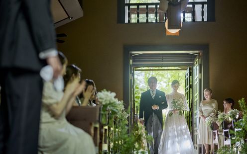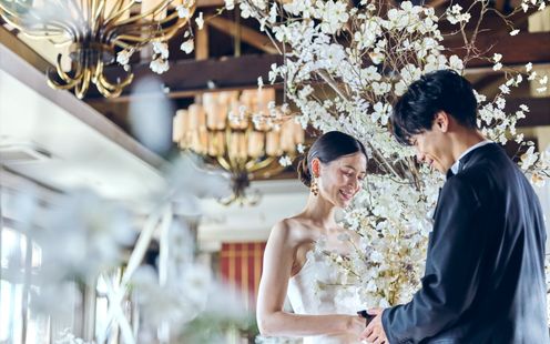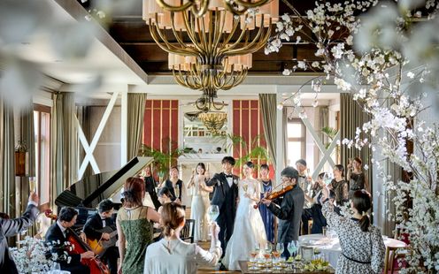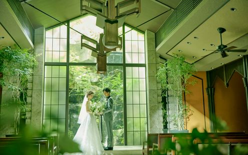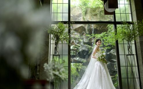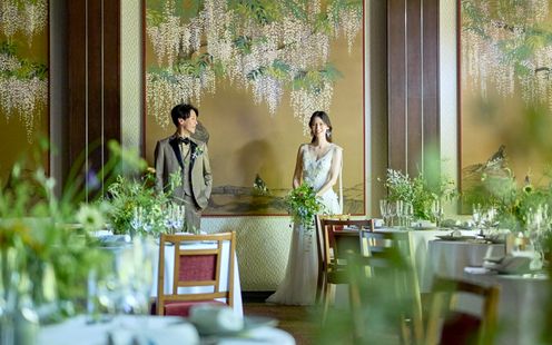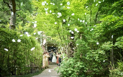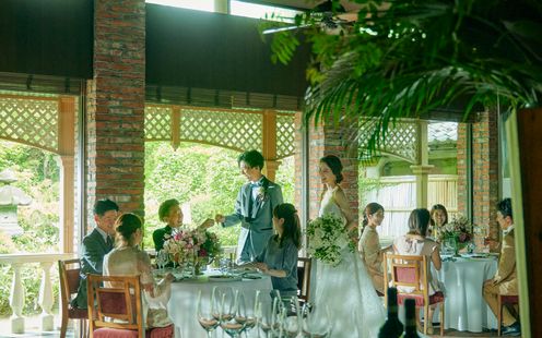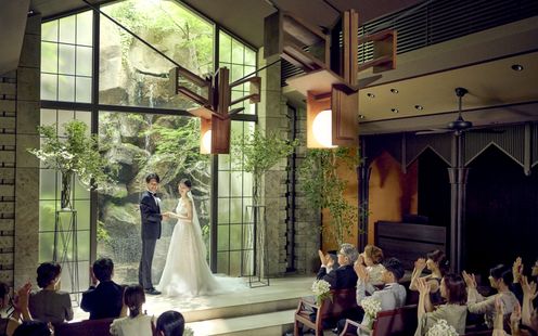 四季折々の花が咲く庭園の先に佇むレンガ造りのチャペル。庭園は楓・松・樫(かし)・槐(えんじゅ)など常に緑で溢れています。挙式は陽光がやさしく降り注ぎ、水音が静かに響く中、一つひとつの瞬間が絵になるセレモニーが実現。オルガンとチェロの音色、聖歌隊の調べの中で行われる神聖なキリスト教挙式と、「ご縁」を大切にする藤屋ならではのオリジナル挙式「結縁式(けちえんしき)」からお選びいただけます。お世話になったかけがえのない人々に見守られながら、ふたりらしい誓いを紡いで。