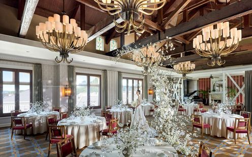 最上階フロアを贅沢に貸切り、ふたりだけのプライベートなパーティを叶える「ザ・グランドホール タイキョク」。高さ7mの天井が創り出す開放的な空間には、ステンドグラスから柔らかな自然光が降り注ぎ、重厚な梁とのコントラストが印象的な美しさを演出します。着席でコース料理を楽しんだ後は、<セカンドルーム>に移動してゲストとビュッフェタイム。季節感あふれるスイーツを並べて、ゲストと笑顔あふれるひとときをお過ごしいただけます。さらに、窓の外には表参道の街並み&雄大な山々が広がり、眺望もおもてなしに!