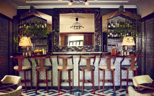鮮やかなタイルのコントラストや、オリエンタルな装飾が目を惹くバーカウンター。