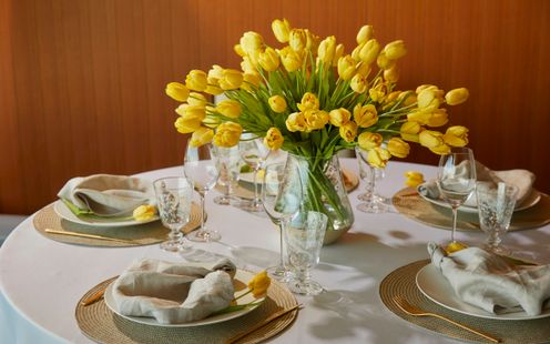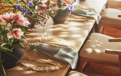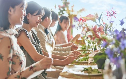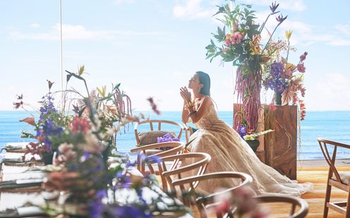 アマンダンブルーのシンプルな空間をおふたりらしく彩るのは、装花のコーディネート。ロケーションにマッチする潮風を感じるようなコーディネートで、大切なゲストへのおもてなしを表現。おふたりのストーリーを紡ぐデコレーションを、オリジナルコンセプトアイテムなども用いて叶えます。