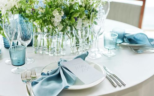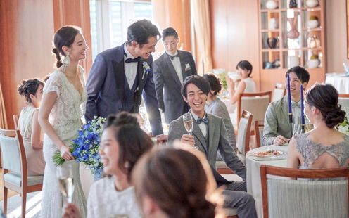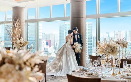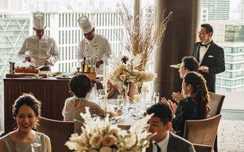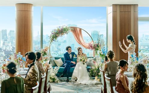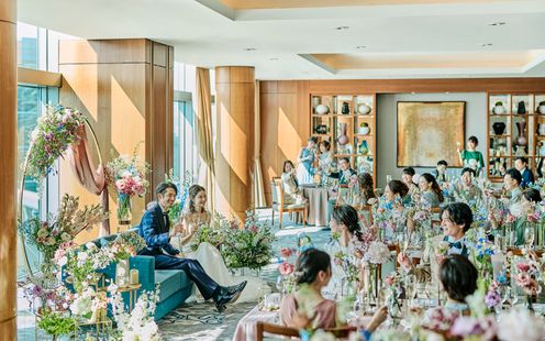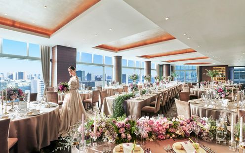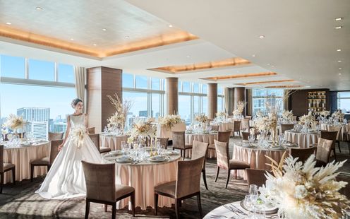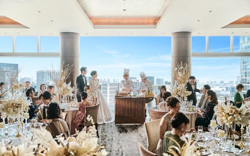 レインボーブリッジや東京タワー、お台場の景色を楽しみながら、ゲストと過ごす寛ぎのひととき。デイタイムからナイトタイムまで時間の移り変わりとともに美景も一変します。優雅な生演奏に耳を傾けながら景色と美食をお愉しみいただけます。また、チャペルと同じフロアにあるので挙式後にゲストの移動もしやすいのが魅力です。最上級のおもてなしでゲストも安心。