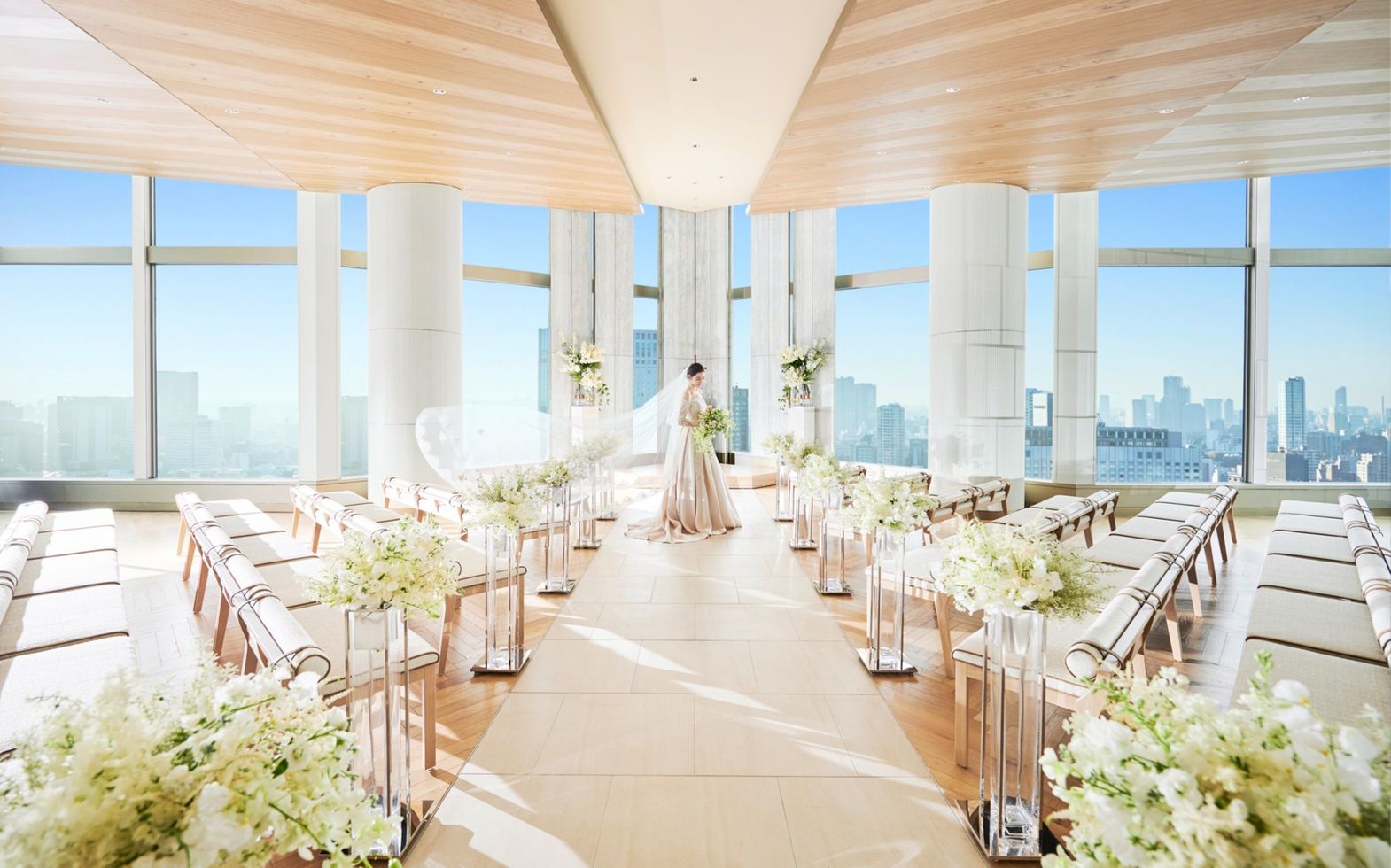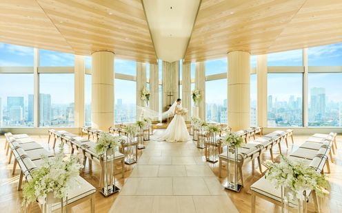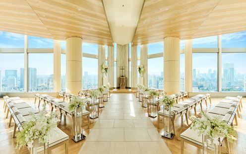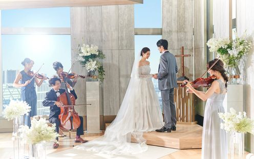 品川駅直結という好アクセス&好立地。空に浮かんでいるかのような天空のチャペルは、大きな窓から開放感あふれる東京タワーや富士山などの東京の絶景をお愉しみいただけます。また、木香のさわやかなフレグランスに包まれるチャペルは、白を基調とし、木目の天井が温かな雰囲気を醸し出しています。挙式のクライマックスシーンはチェロやバイオリン、ヴィオラ奏者による、弦楽四重奏の清らかな音色に包まれて厳かなセレモニーが叶います。