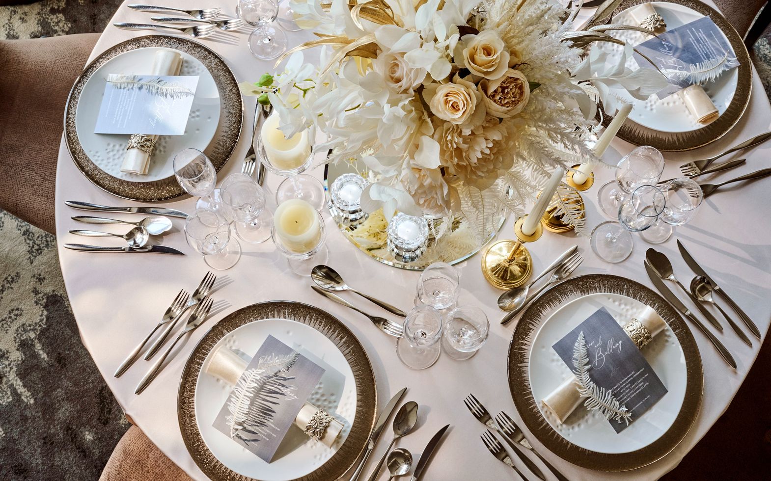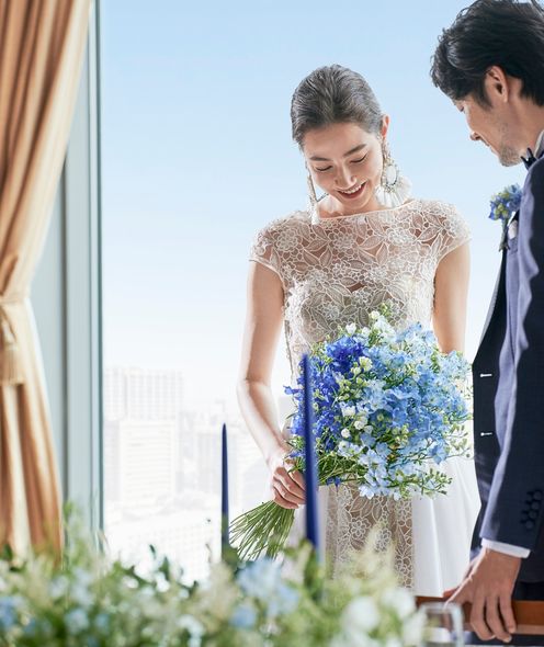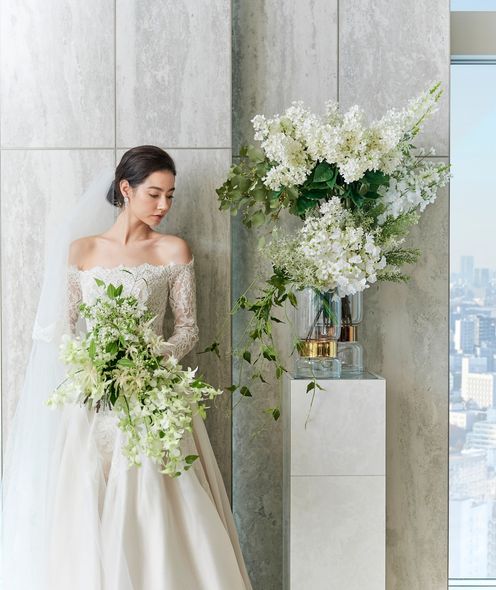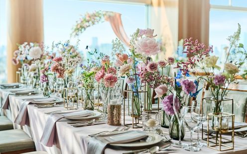 どこにアレンジしたら映えるかなど、会場のことを知り尽くした専属のフローリストがふたりの好みやイメージに合わせて空間を創り上げます。空間演出は装花だけにとどまらず、洗練されたアイテムもあしらってふたりの世界観を完成させます。