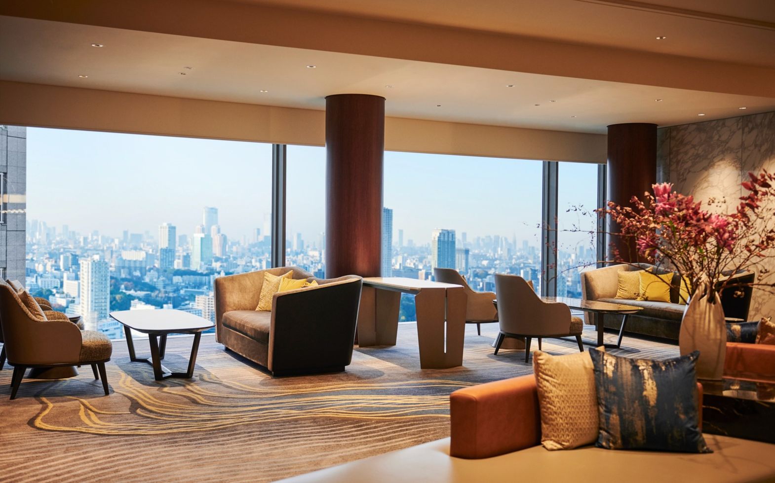 居心地のよいソファ、ファブリックが彩るゲストラウンジ。ここからも都心の景色を一望いただけます。