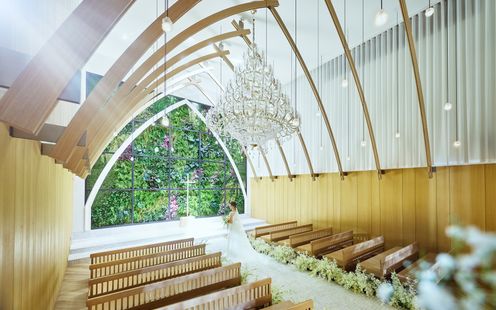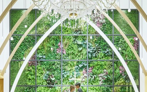 グリーンウォールとシャンデリアが印象的!柔らかな光と木のぬくもりがセレモニーに華やぎを