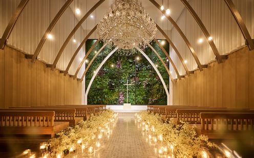 7mの天井高にゴールドブロンズのアーチ天井と壁に浮かび上がる十字架が印象的。屋内ながら開放感に溢れ、柔らかな光と木の温もりが永遠を誓うふたりを包みこみます。美しく響く讃美の拍手とオルガン、バイオリンの音色、華やぎを添えるシャンデリアの煌めきがふたりの門出をよりドラマチックに演出してくれます。季節や天気に左右されることなく、花嫁が美しく映える点も魅力!※着席80名まで