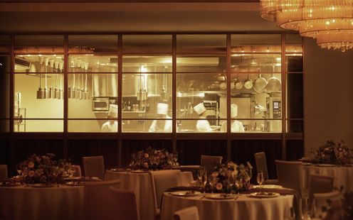 隣接するオープンキッチンから出来立ての料理でのおもてなしが叶うアットホームな空間「メインダイニング DINER」。気心の知れた家族や親族、親友で行う少人数パーティに最適!モダンな色合いの空間なので和装姿の花嫁も美しく映えます。ゲストと食事と会話中心のパーティを希望するふたりにおすすめ!