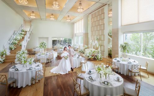 白を基調とした透明感ある披露宴会場は、2階まで吹抜けで天井高8mの開放感あふれる大空間。大階段からの新郎新婦入場は、ゲスト皆さまの目線を一身に集め、ロマンチックな一瞬になること間違いなしです。併設の専用テラス、ホワイエまでワンフロア貸切で使えるから、ウェルカムパーティやデザートビュッフェなどふたりらしいおもてなしの演出も叶います。