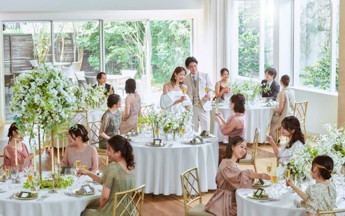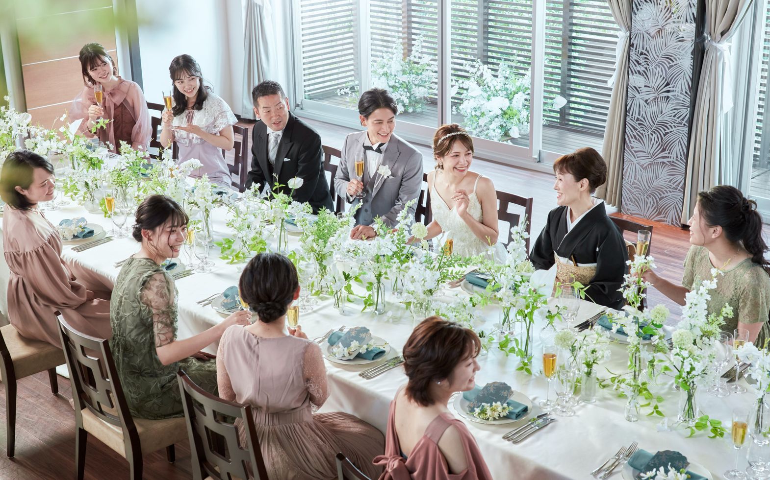 特別な一日を大切な方々を近くに感じながら過ごせる披露宴会場は、あえて豪華な装飾を使わず、木の優しさを残して自然光と木目のコラボレーションが和やかな時間を創り上げています。併設の専用テラスやホワイエまで、ワンフロア貸切で使うことができ、デザートビュッフェやテラスでのフォトタイムなど、かけがえのない時間を楽しんでいただけます。ゲスト皆さまとの距離感も近く、ファミリーウェディングにもおすすめのパーティ空間です。