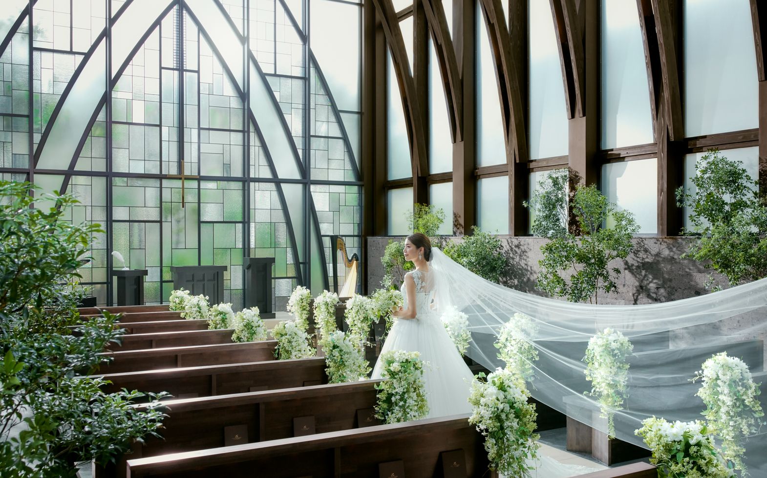 3面の窓から柔らかな自然光が降り注ぐ、京都最大級の独立型木造チャペル。天井高・バージンロードともに13メートルという圧倒的なスケール感が特徴です。正面の窓には透明のステンドグラスを用い、ひとつひとつ異なる表情をお楽しみいただけます。石壁から伸びる天然木が幾重にも連なって美しいアーチをつくり、チャペル内にハープの音色が優しく響き渡ります。アーチを描く天井やベンチシートは木の表情をそのまま活かし、ふたりの晴れ姿をより一層引き立てます ※教会式・人前式・和装人前式が叶います。