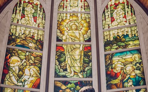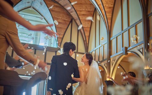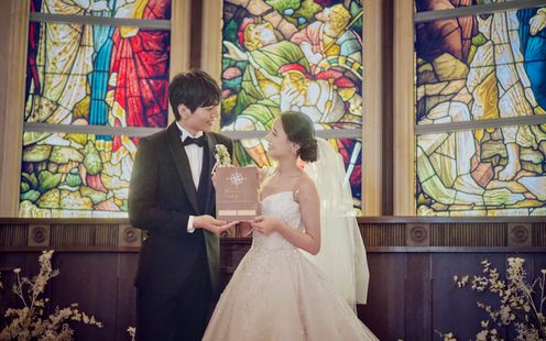 100年の歴史を刻むキリストの「復活」を描いたステンドグラス見守られながら人生の門出を”出航”になぞらえ”旅立ち”をコンセプトにした結婚式