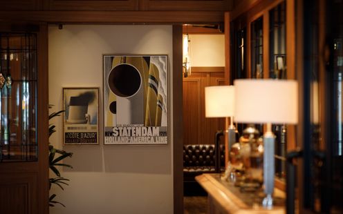 羅針盤が埋め込められた特注のテーブルなど豪華客船をテーマに
