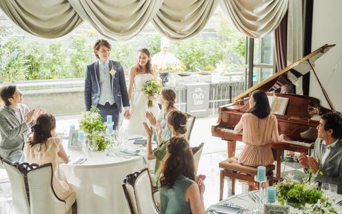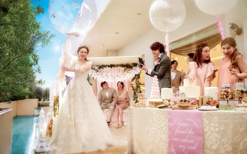 開放感あふれるリゾート地を思わせる空間では《アクアセレモニー》や、チャペルでの挙式後にバルーンリリース、フラワーシャワーなどのアフターセレモニー、またパーティ後半にデザートビュッフェ&ドリンクを囲んで歓談タイム、フォト撮影などふたりの希望に沿った演出をお楽しみいただけます。憧れのイメージがあれば何でも気軽にご相談ください。