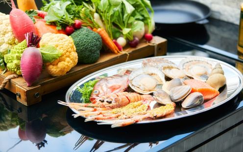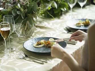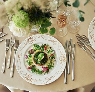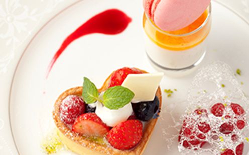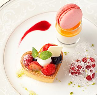 幅広い世代が出席する晴れの日にふさわしい、箸でも食べられる「フレンチ・ジャポネ」を用意。上品でありながらどこか懐かしい料理で、ゲストへ最幸のおもてなしをいたします。併設のオープンキッチンから出来立ての料理をふたりの大切なゲストへサーブいたします。また、ふたりの思い出を元に、オートクチュールでコースを創り上げることも可能ですので気軽にご相談ください。