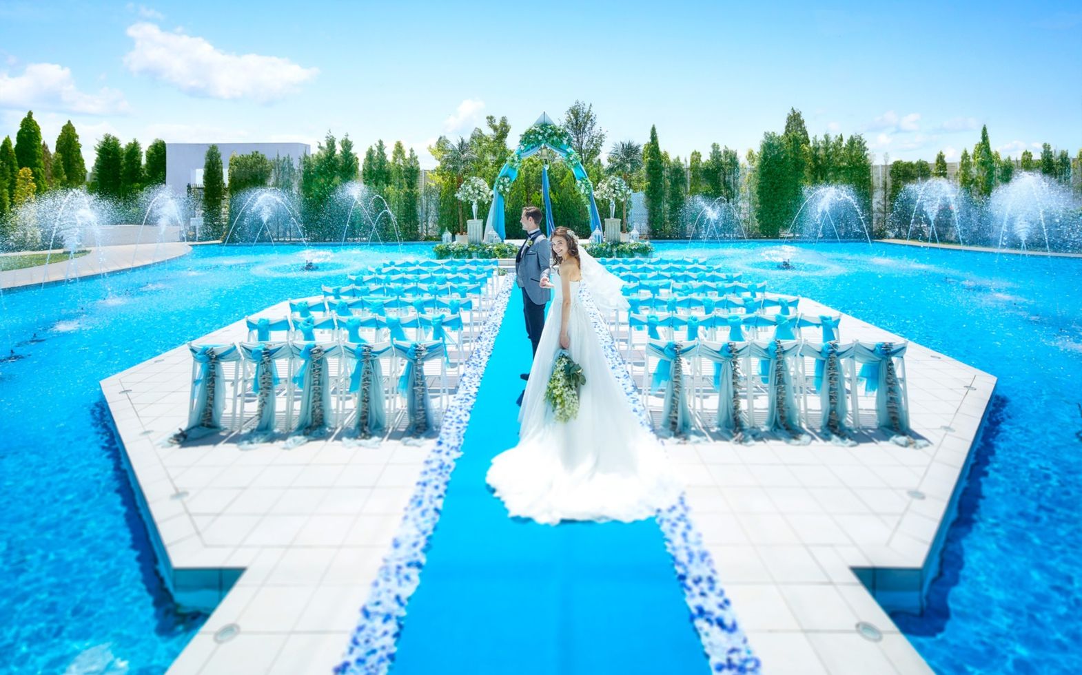 2つの貸切邸宅の間に佇む水辺のチャペルでリゾートウエディングのような《アクアセレモニー》