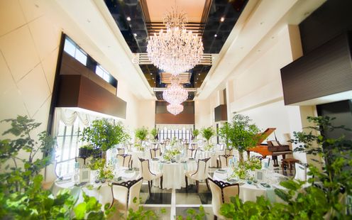 天井高8mの開放的な空間にはシャンデリアが煌めき、窓の向こうに広がる緑溢れるガーデンがくつろぎの時間を生み出します。