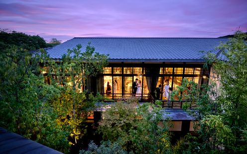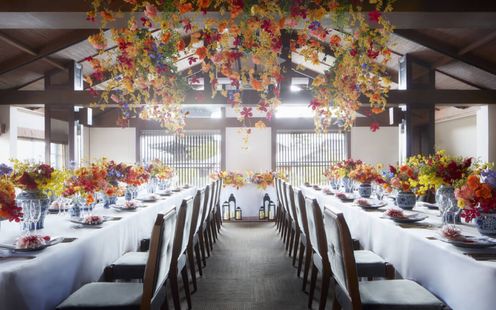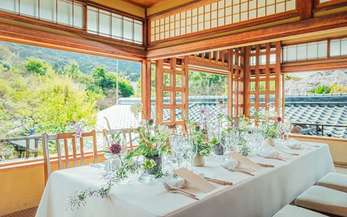 3面ガラス張りでどの角度からも美しい緑を眺められ、常に自然の中にいるような贅沢な空間を演出。日本家屋の長い廊下を抜けた先に位置する隠れ家のような佇まいは、プライベート感を大切にするふたりに人気です!1年中美しい緑に囲まれた自然豊かな空間で、ゲストと共に過ごすカジュアルでありながら洗練された時間は、特別な1日になるはず。