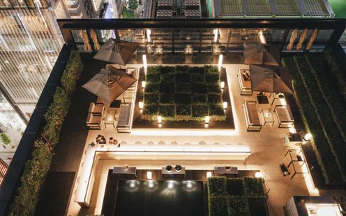 ツイード柄に刈り込まれた庭園が広がるルーフトップテラス