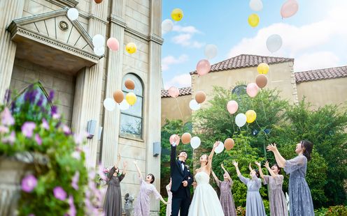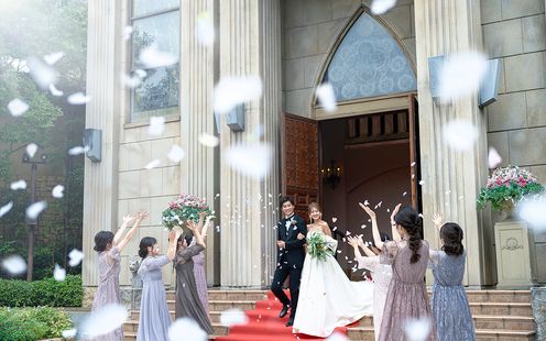 ロンドンを象徴する有名な大聖堂から祝福のメッセージを受けたこともある由緒ある大聖堂。天井高20mの開放感あふれる聖堂内には自然光が降り注ぎ、ステンドグラスを通して彩られる陽光は花嫁を美しく魅せます。オルガニスト・バイオリニスト・フルーティストと聖歌隊が奏でる優しい調べが挙式を一層ドラマティックなものに。挙式後は頬をなでる爽やかな風を感じながら青空のもと、「セントラルコート」でフラワーシャワーやバルーンリリース、ブーケトスなど笑顔に包まれるアフターセレモニーをお楽しみいただけます。一見の価値ありの大聖堂をまずは見学して体感ください。
