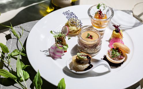 当館自慢のコースは、和のエッセンスが感じられるフランス料理。旬の食材にこだわり、結婚式らしいアーティスティックな逸品の中にも、和のお料理特有の旨味が感じられる、幅広い年齢層に親しまれる料理を提供します。「想い出の味を再現したい」「実家の野菜を使った一品をふるまいたい」こんなふたりの想いを料理で形にするお手伝いもしております。おふたりの結婚式でしか食べられないという特別感をゲストにお届けします。