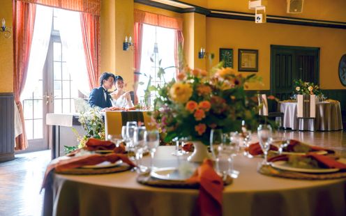 イタリアンイエローで纏められた華やかで開放的な会場。ヨーロッパ直輸入のインテリアに照らされて、ひときわ贅沢な1日を演出いたします。大人数様でもゆったりとお過ごしいただける空間で、盛り上がるシーンを作り上げます。