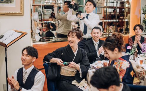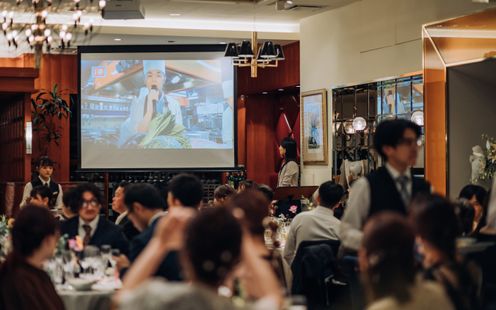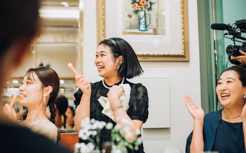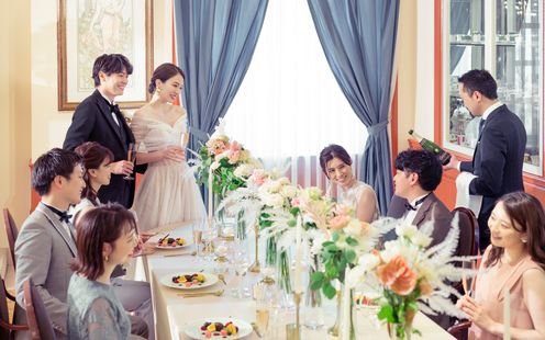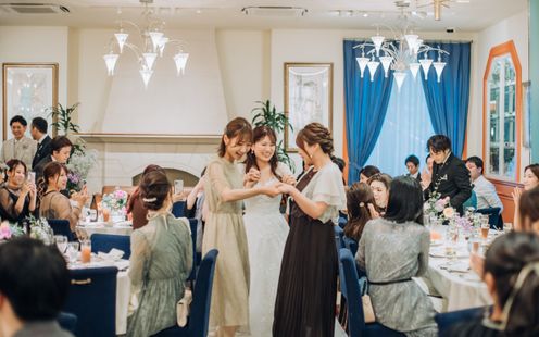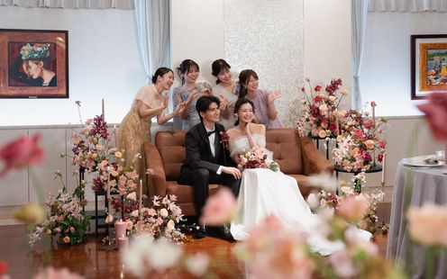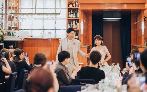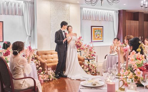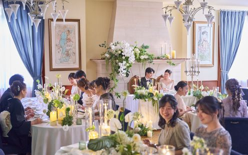 パーティ会場は、110名まで着席可能な【ラ・ロシェル】気品溢れる空間でありながら、ゲストと距離近く過ごせると人気な会場。普段と変わらない2人らしさを大切に、ゲストとの会話・写真を楽しみたいと「歓談」や「ゲーム」などを取り入れ、笑顔溢れる時間を過ごされました。