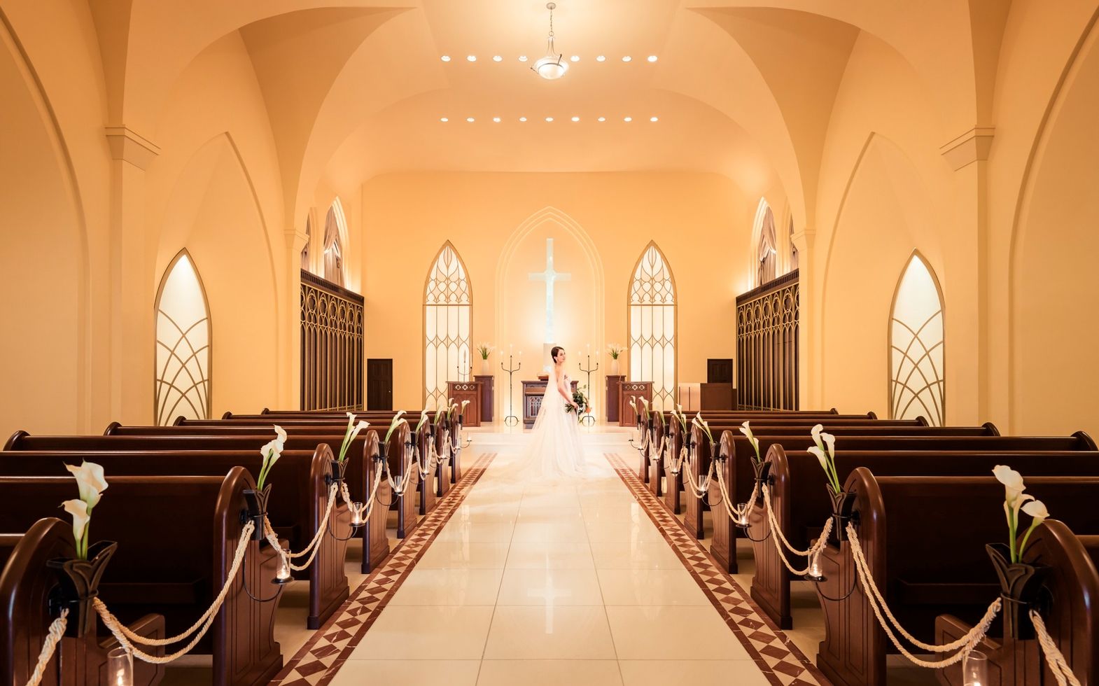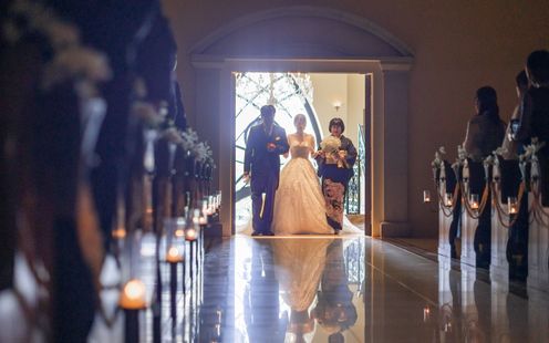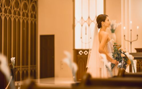 アーチを描いた7mの天井高が優しく包み込み、聖歌隊の生演奏を美しく響き渡らせる。入場時には自然光がふたりを照らし、鳥肌が立つような神秘的な空間を演出。13mもの大理石のバージンロードには花嫁姿が映り込み、挙式本来の意味を大切にした本物の結婚式がはじまる