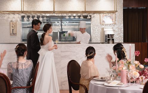 「懐石料理×フレンチ」を組み合わせた美食はここだでしか味わえない。20年以上愛され続けている、婚礼メニューはオープン当初から変わらない内容をご用意。ラ・ロシェルが突き詰めた最上のコース料理を皆様にご提供できるように。また、記念日などレストランにお越し頂いた時も ”結婚式の時に食べた料理” を愉しみながら、想い出に浸って頂けるように。レストランだからこそ叶う一流の料理・サービスで素敵なひと時をご提案