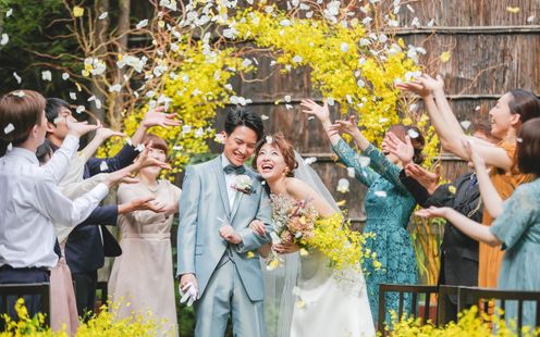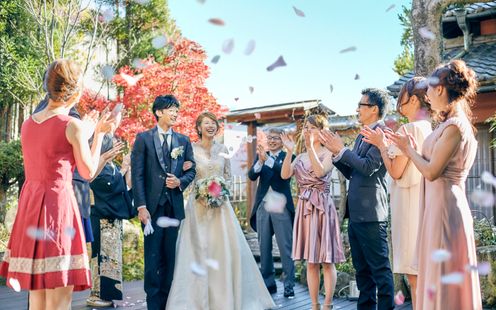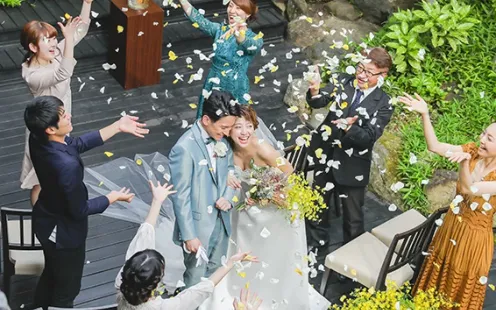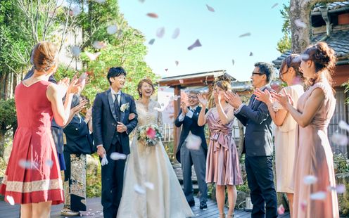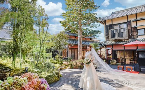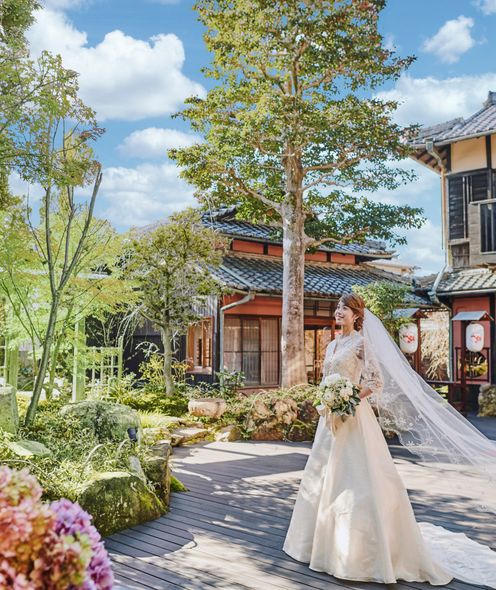 ウッドデッキガーデンではガーデン挙式をはじめ、チャペルで挙式のあとに青空のもとでフラワーシャワーやお菓子巻きなどアフターセレモニーもお楽しみいただけます。また、別棟の日本家屋にも中庭があるので季節ごとの優しい風を感じながら和装で記念撮影をするのもおすすめ。