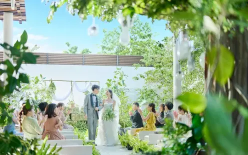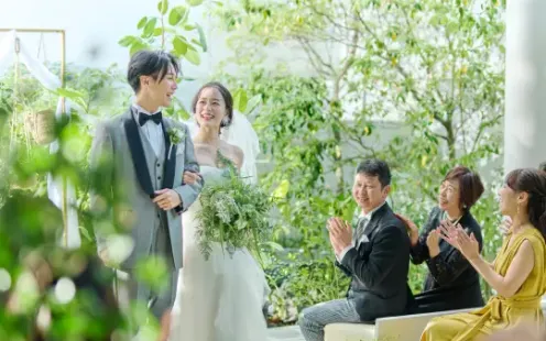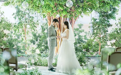 全天候型の<森のテラス>で緑に囲まれながらの温かなセレモニーを