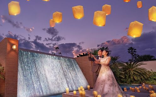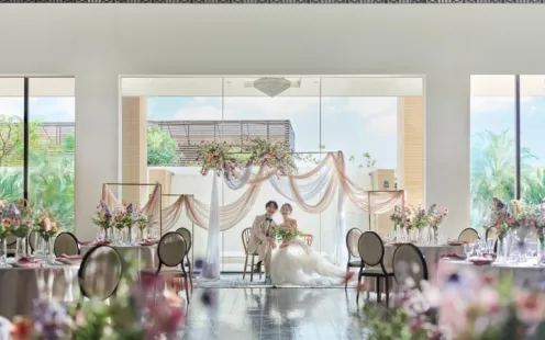 「コーラル」は、ナチュラル&ラグジュアリーをコンセプトにデザインされた華やかなバンケット。また、大階段やプール付テラス、最新のプロジェクションマッピングなどを自由に使って、おふたりらしい演出を実現できます。