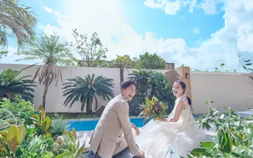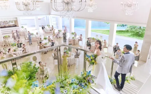 青空が迎えてくれるプール付テラスが、より一層リゾート感あるパーティーシーンを演出します。美しい芝生や、水きらめくテラスを自由に行き来しながら、動きのあるおもてなしを。おふたりのために集まってくれた大切な人たちに、日常の喧噪を忘れられる、ゆったりとした贅沢な時間をプレゼントすることができます。