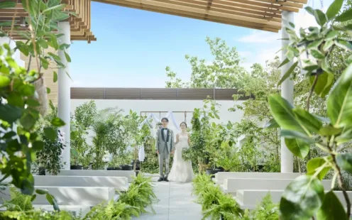 グレイスヒル・オーシャンテラスではチャペル以外にも、緑のそよ風が吹き抜ける空間で、プライベート感あふれるセレモニーを行えます。ナチュラルで贅沢な空間は、永遠の愛を誓うおふたりをやさしく包み込みます。
