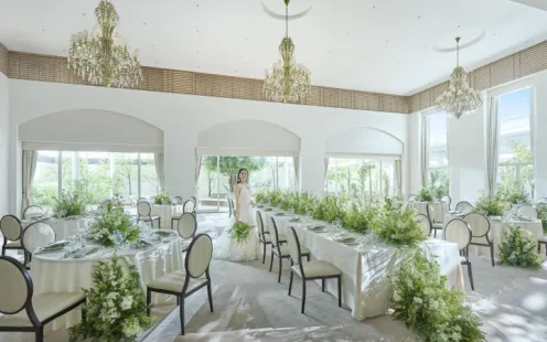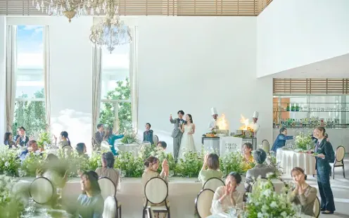 落ち着いた色合いで統一された「ラグーン」では、大きな窓の向こうに広がるさわやかなロケーションと、柔らかな自然光に包まれながら、ヨーロッパの高級リゾートさながらのパーティーをお愉しみいただけます。またライブキッチンやデザートブッフェ、フォトブースなど、おふたりらしい演出を自由にお愉しみいただけます。