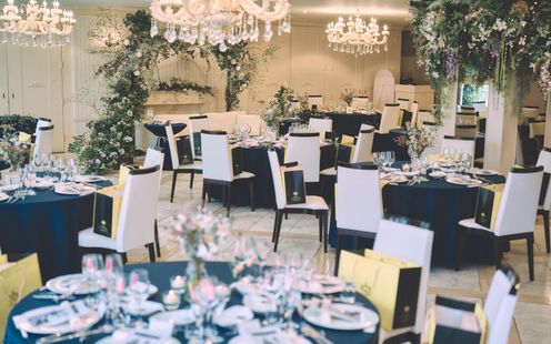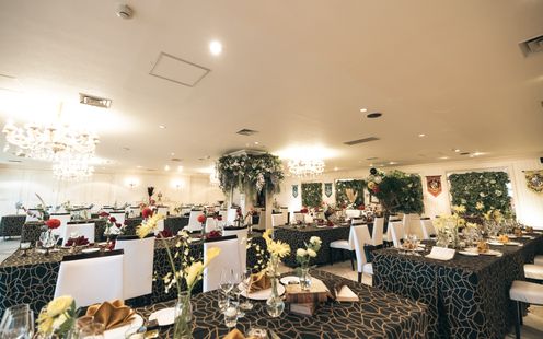 優しい陽光が降り注ぐ、白を基調とした明るいパーティ会場