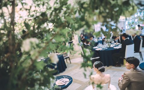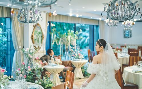 窓の外を緑が彩る開放感いっぱいのバンケットルーム。シックで落ち着いた雰囲気の中にも可愛らしさがあるシャンデリアと特別にあしらったお出迎えの一皿、有田焼のショープレート。 明るい中で、お食事と会話をお楽しみいただける大人のレストランウェディングが叶います。ペットも一緒にパーティに参加してできるのは嬉しい限り!