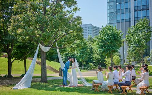 爽やかな風と柔らかな太陽の光、輝く緑に囲まれた専用テラス。ダイニングに面した緑溢れるテラスではゲストとお二人も自然な笑顔に。アクセス抜群の品川にありながら、緑と空が彩る広大なテラスでここでしか叶えられないウェディングを。東京タワーも望める広大な庭園は、絶好のロケーション!