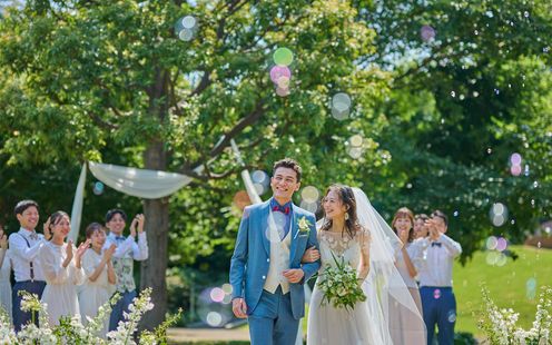開放的なテラスで行うパーティーでは、緑と青空が二人を祝福する